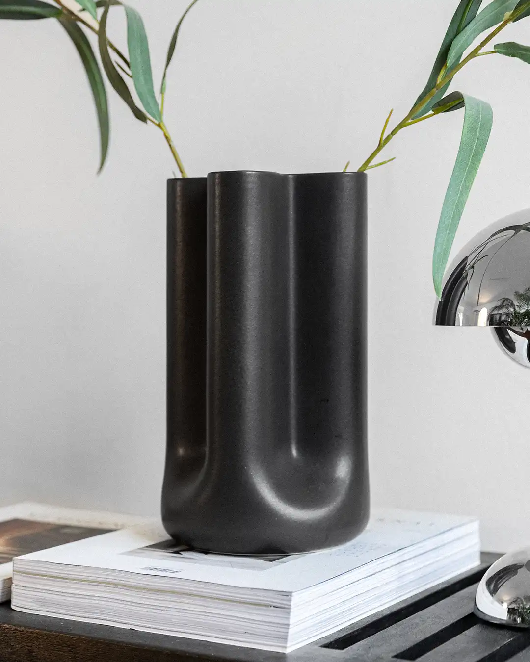 The black ceramic vase is handcrafted in Kuopio, Finland, using a two-piece plaster mold. After the clay is carefully cast and shaped, the vase undergoes firing in a kiln to achieve its durability and form. The interior is finished with a glossy glaze, while the exterior with a matte surface. The vase is inspired by the rare four-leaf clover. Its more common three-leaf counterpart, found throughout Finland, typically grows to a height of up to 30 cm.